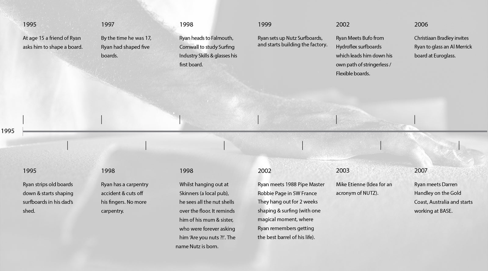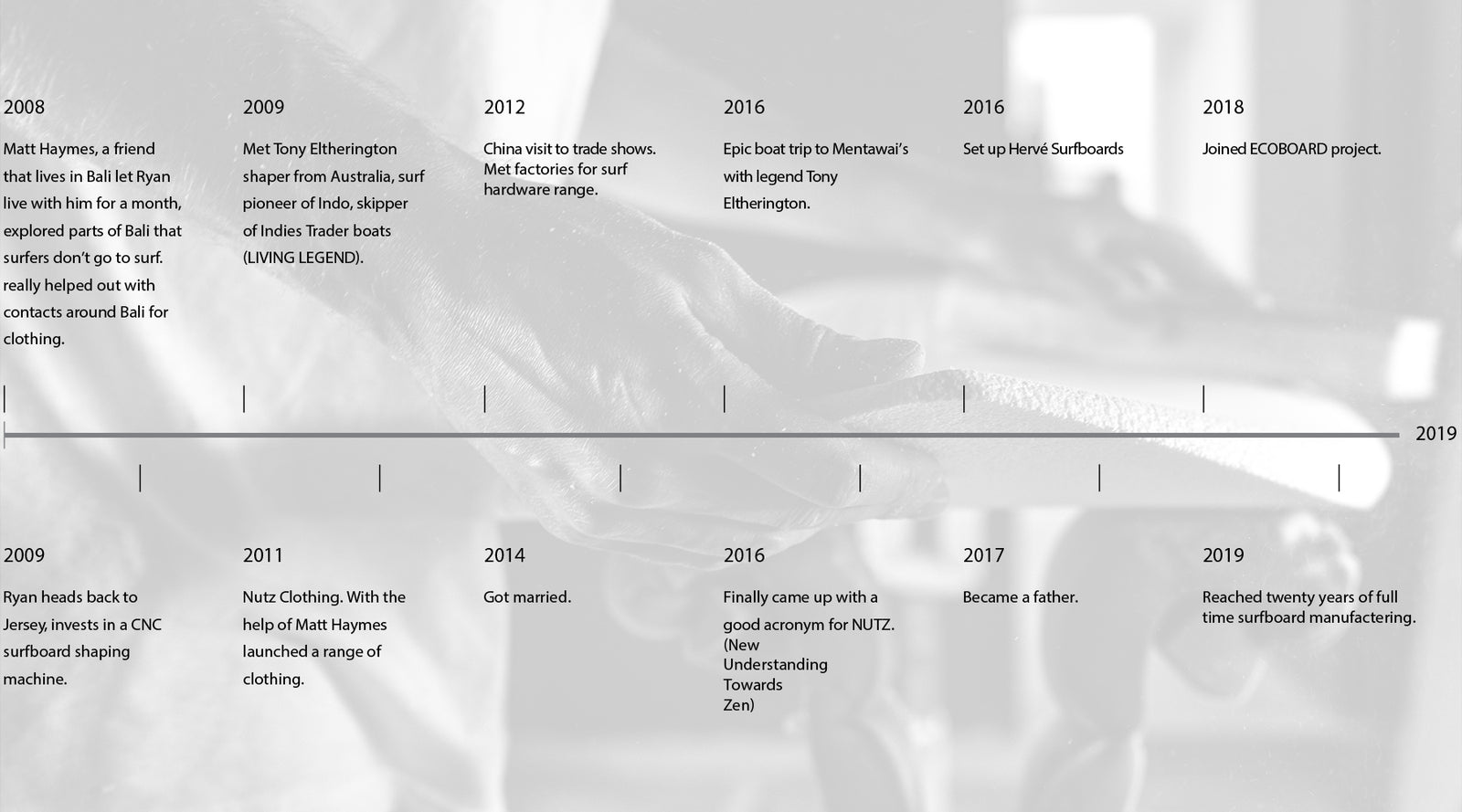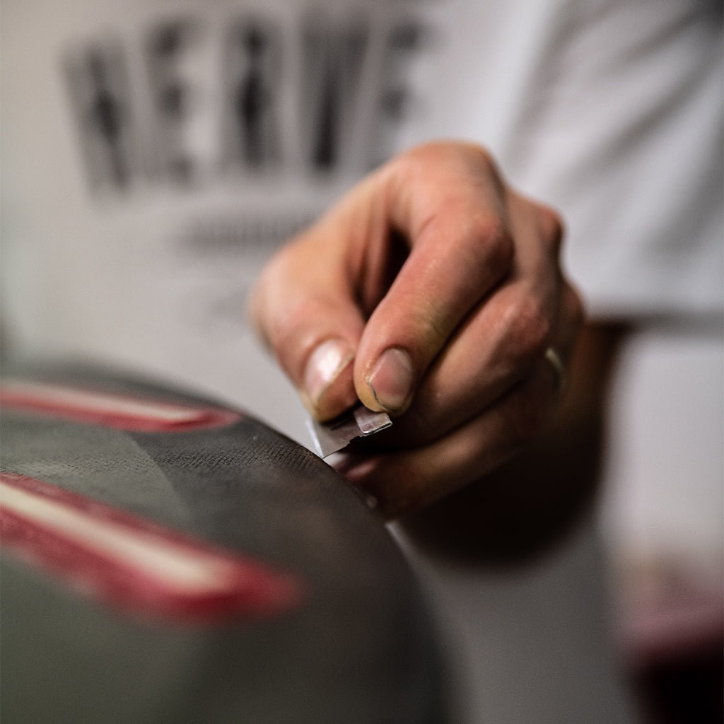 Ryan Hervé has been shaping surfboards since 1995. At just fifteen, he picked up a planer and learned the craft the old-school way—before CAD software and CNC machines became standard. In 1999, he founded Nutz Surfboards, initially building boards he wanted to ride himself. Over the years, he worked on some of the world's best high-performance boards for renowned shapers like Al Merrick, JS, and DHD.