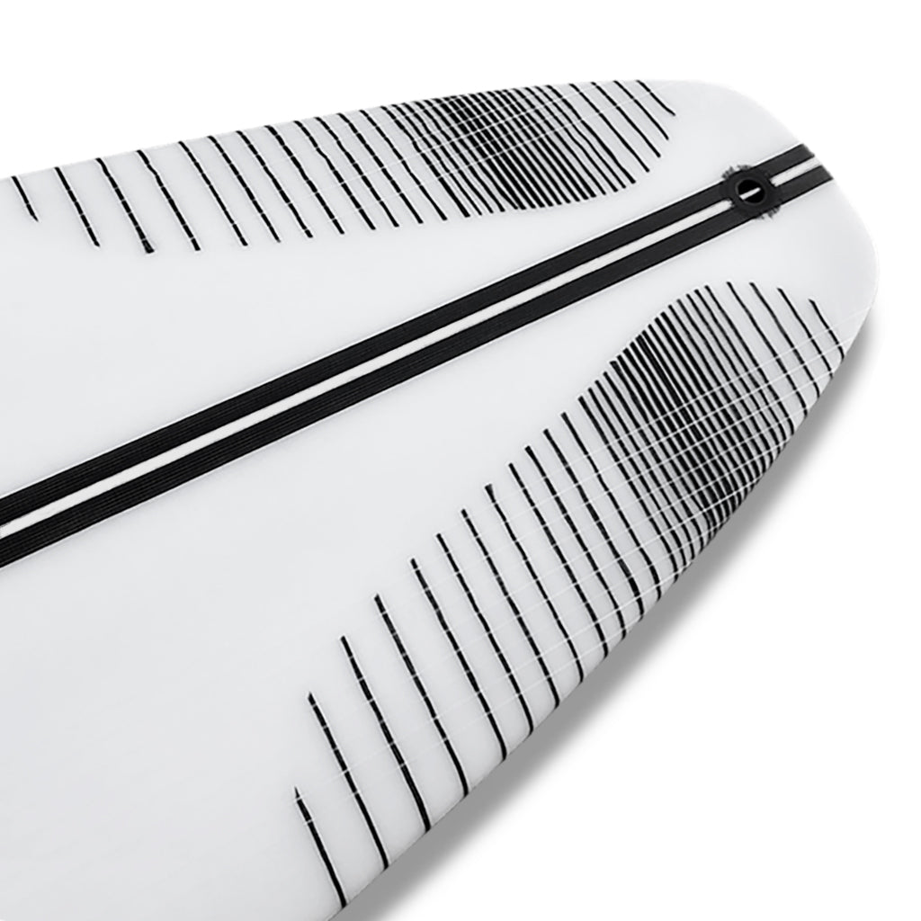A custom web-fused carbon patch helps protect the most vulnerable part of the board which is prone to damage. The direction of the carbon strands also prevent stiffening of the natural linear flex pattern.